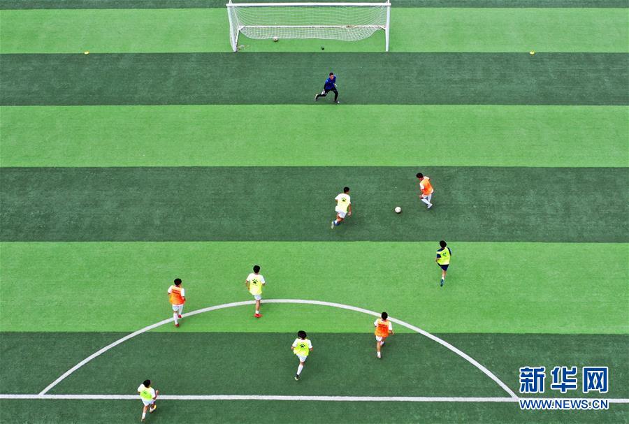这是河南省实验中学高中足球队队员在进行对抗练习(7月21日无人机拍摄)。 新华社记者李嘉南摄