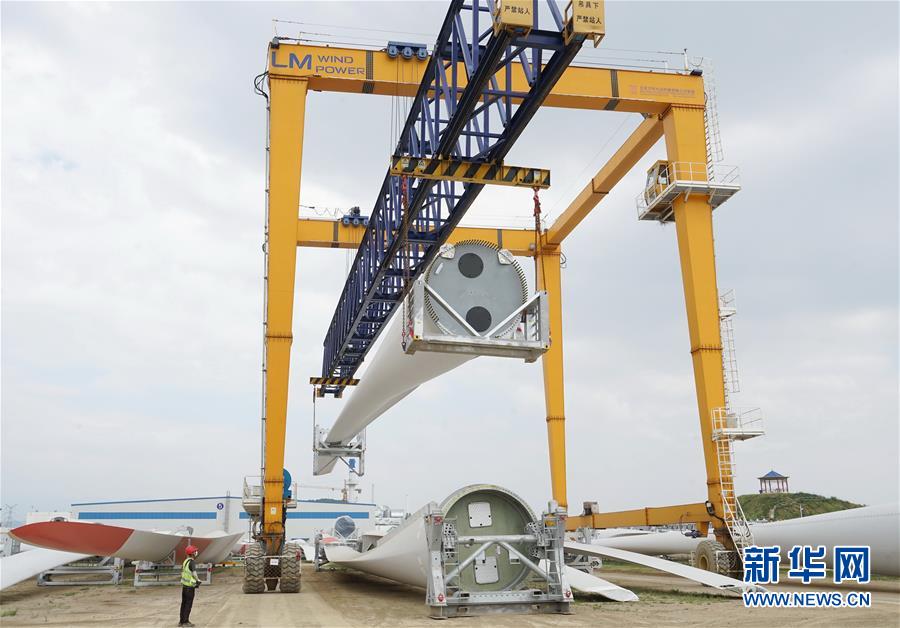 8月1日,秦皇岛经济技术开发区一家风电设备生产企业的工人在操作吊装设备吊运风力发电机叶片。