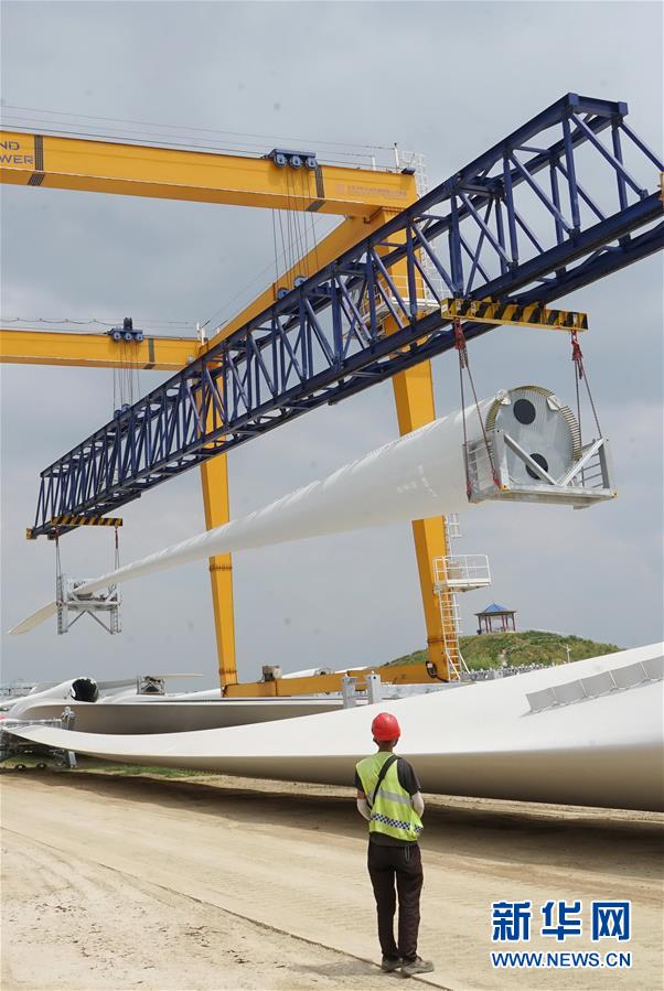 8月1日,秦皇岛经济技术开发区一家风电设备生产企业的工人在操作吊装设备吊运风力发电机叶片。新华社记者 杨世尧 摄