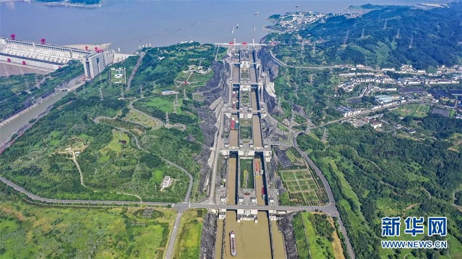 8月1日,船舶通过三峡五级船闸(无人机照片)。 水利部长江水利委员会7月31日发布调度令:8月1日5时起,三峡水库出库流量按34500立方米每秒下泄,为近期因为长江汛情而滞留的船舶创造通行条件,及时疏散滞留船舶。 新华社发(文桭效 摄)