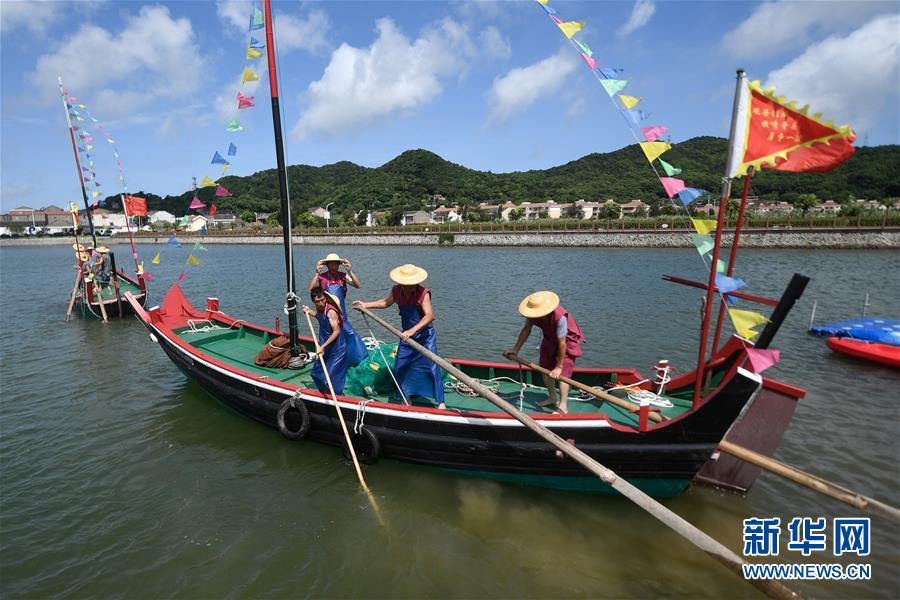 8月1日,蚂蚁岛居民在避风塘渔民劳作现场体验区为游客表演木帆船捕鱼。 新华社记者 黄宗治 摄