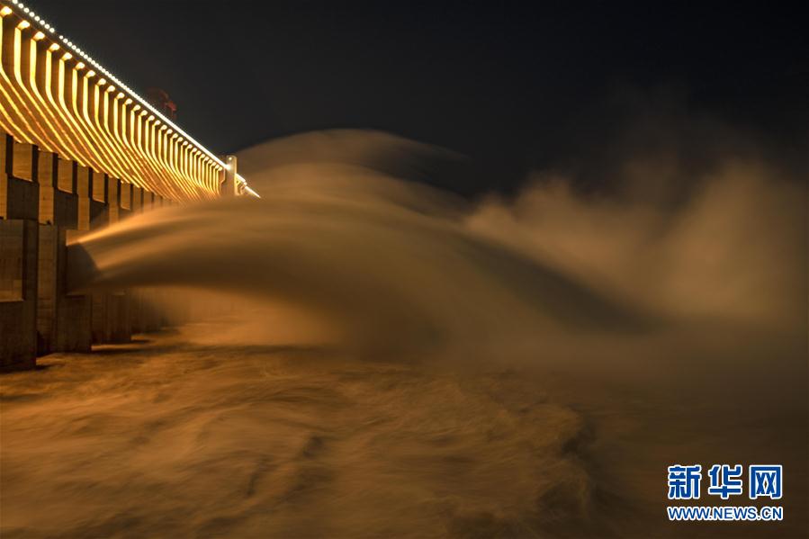 7月31日晚拍摄的三峡大坝泄洪景象。 入夜,三峡工程景观灯开放,整个景区更加壮丽多彩。 新华社记者 杜华举 摄