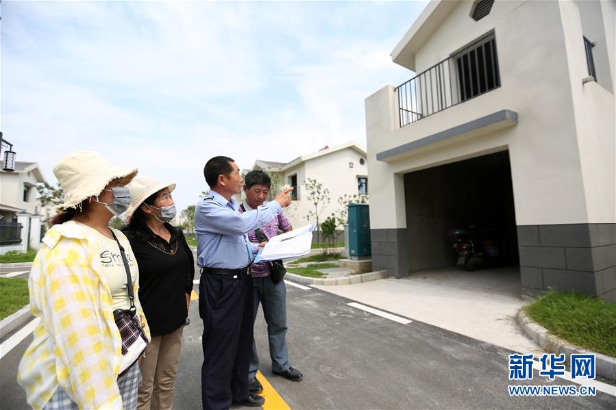 8月2日,淮安市洪泽区朱坝街道曹庄村农民住房条件改善项目“田园雅居”的物业工作人员带着刚拿到新房钥匙的业主验房。 新华社发(陈凯 摄)