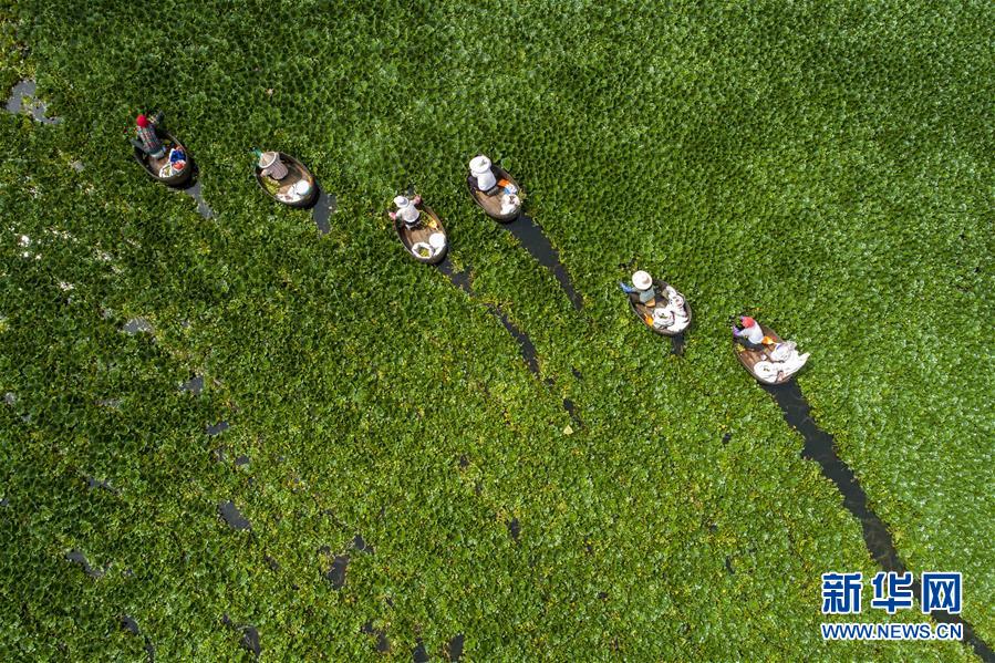 8月2日,南舍村村民划着菱桶采摘菱角(无人机照片)。 盛夏时节,江苏省泰州市农业开发区南舍村的菱角进入成熟季,村民忙着采摘菱角,成为水乡特有的丰收景象。 新华社发(汤德宏 摄)