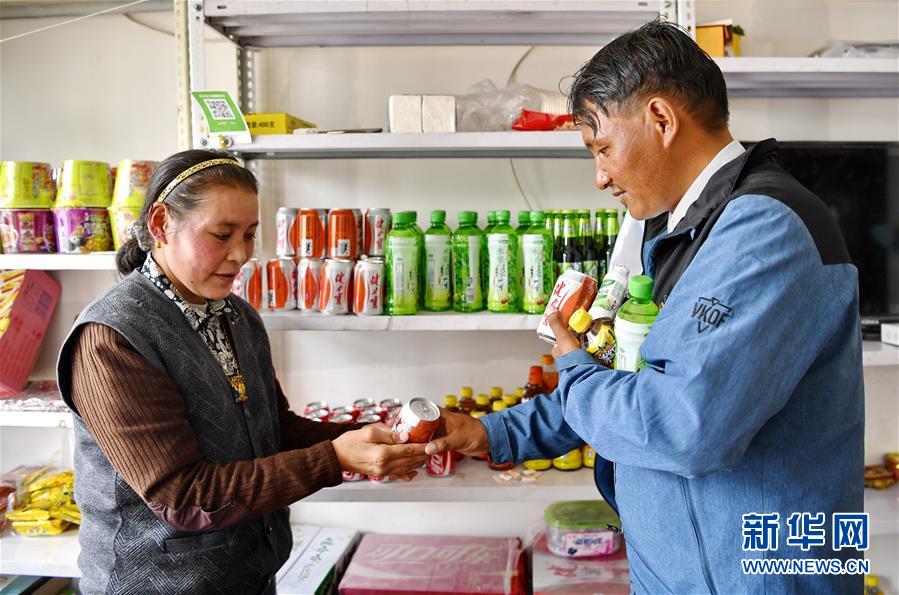 从那曲申扎县搬迁到彩渠塘村的村民旺扎(右)和妻子塔吉在往自家小卖部的货架上摆放饮品(8月2日摄)。 近年来,西藏自治区多措并举,实施易地扶贫搬迁,解决“一方水土养不起一方人”的发展困境,使搬迁户实现稳定脱贫、安置区加快发展,为乡村振兴奠定了坚实基础。 西藏拉萨市当雄县羊八井镇彩渠塘村的150户683名村民是2017年底开始陆续从那曲、阿里、昌都等地区极为艰苦的地带搬迁而来的。村民原来大多在高寒地区随牧而居、没水没电、缺医少药。来到新村后,不仅衣食住行和医疗都有了保障,还靠羊八井地热温泉旅游入股分红,发展绵羊育肥、手工加工合作社等集体经济和就近就便务工增加收入,村民们过上了幸福的小康生活。 新华社记者 张汝锋 摄