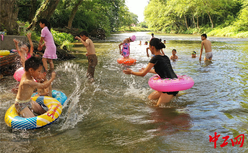 2020年8月2日,在江西省吉安市泰和县沙村镇珠陵江水上乐园,游客正在戏水消暑。连日来,泰和县持续高温天气,乡村涉水旅游项目受到游客青睐,高温催热乡村生态旅游。邓和平/视觉中国