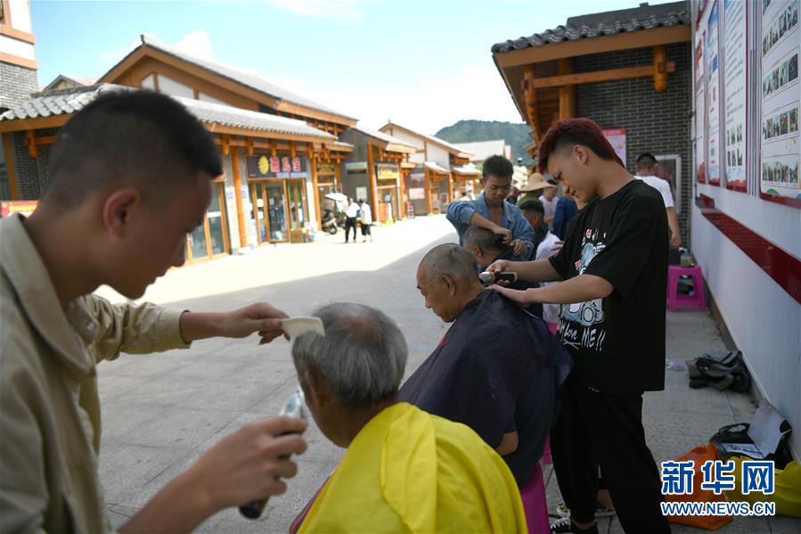 志愿者在柏杨林易地扶贫搬迁安置点为老人免费理发(8月3日摄)。 贵州省毕节市七星关区柏杨林易地扶贫搬迁安置点是毕节市最大的易地扶贫搬迁安置点,总面积约1.1平方公里,从2017年开始至今,共有34个乡镇6372户29001人安置到位。 如今,安置点内教育、医疗、就业扶贫车间、长幼日间托养照料中心等设施齐全,搬迁群众在这里过上了安居乐业的幸福生活。 新华社记者 金良快 摄