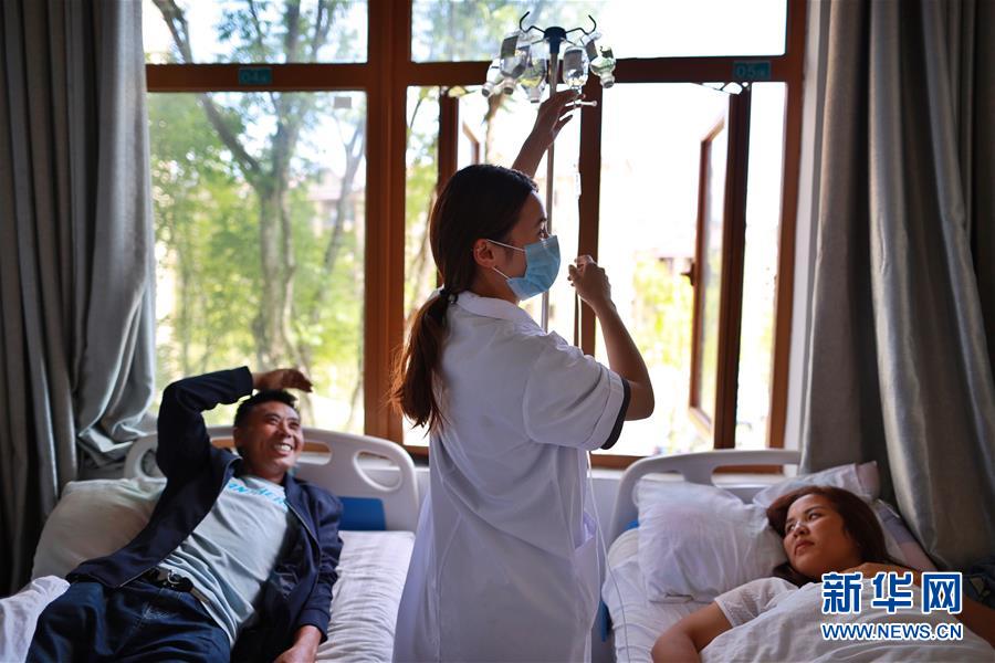 搬迁群众在柏杨林易地扶贫搬迁安置点卫生院内治疗(8月3日摄)。 贵州省毕节市七星关区柏杨林易地扶贫搬迁安置点是毕节市最大的易地扶贫搬迁安置点,总面积约1.1平方公里,从2017年开始至今,共有34个乡镇6372户29001人安置到位。 如今,安置点内教育、医疗、就业扶贫车间、长幼日间托养照料中心等设施齐全,搬迁群众在这里过上了安居乐业的幸福生活。 新华社记者 刘续 摄
