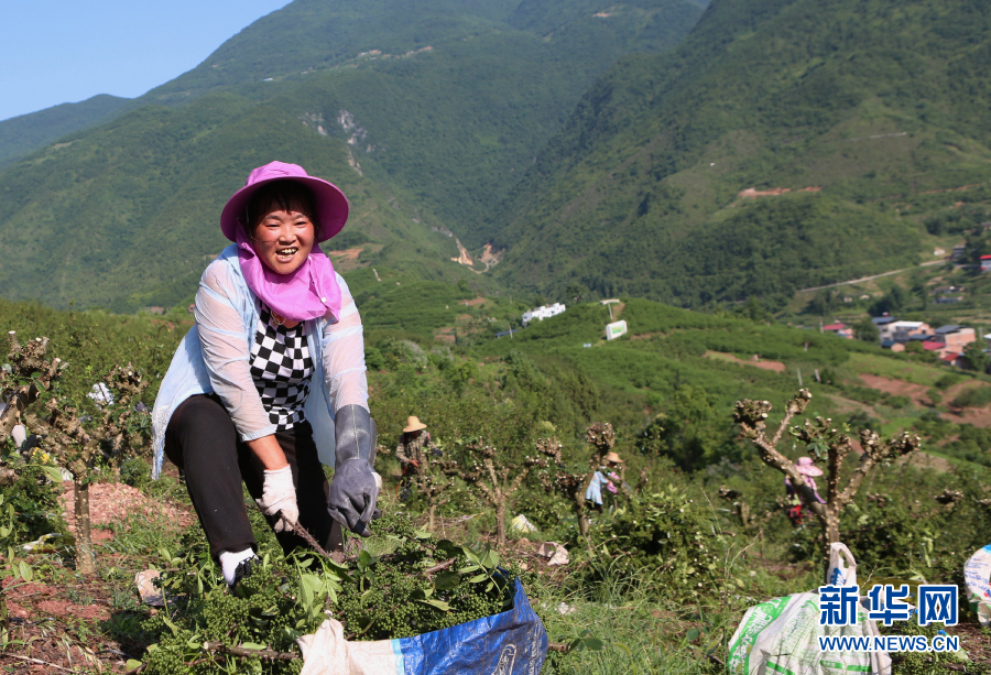 2017年起,巫山县根据当地土壤、气候环境因素及对花椒市场的考察,把花椒种植作为了助农增收脱贫的重要产业。花椒园主动吸纳了周边贫困村民在花椒园务工,带动了贫困群众增收。图为村民们在高兴地收割花椒。新华网发(卢先庆 摄)