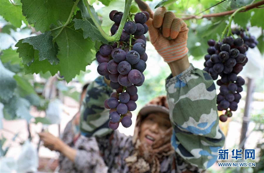 8月4日,在唐家房镇果子园村鞍山绿泰佳葡萄园,工人在剪摘成熟的葡萄。 辽宁省鞍山市唐家房镇果子园村位于风景秀美的千山脚下,村里有一个鞍山绿泰佳葡萄园,园里的葡萄用牛奶、豆饼发酵浇灌喂养,不施农药化肥。这里集成温室栽培、冷棚栽培、露天栽培等多种技术,葡萄园一年四季葡萄飘香,所产有机葡萄产品销往全国各地。据了解,该葡萄园带动附近村民就业增收的同时,还发展成为生态采摘体验基地,吸引游客前来采摘体验。 新华社记者 姚剑锋 摄