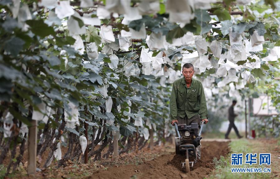 8月4日,在唐家房镇果子园村鞍山绿泰佳葡萄园,工人在犁地,通过这种方式让土壤保持松软。 新华社记者 姚剑锋 摄