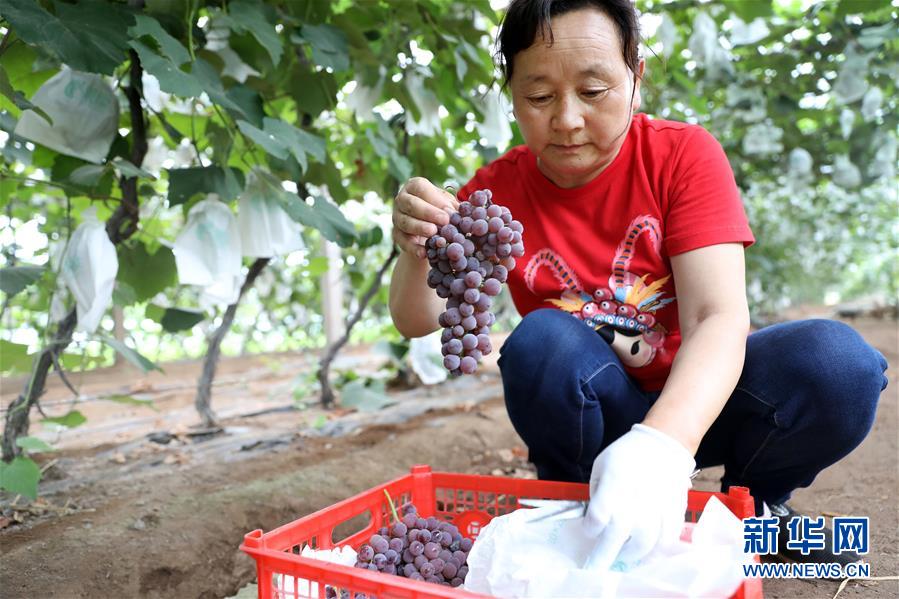 8月4日,在唐家房镇果子园村鞍山绿泰佳葡萄园,工人将采摘的葡萄放入篮里。 新华社记者 姚剑锋 摄