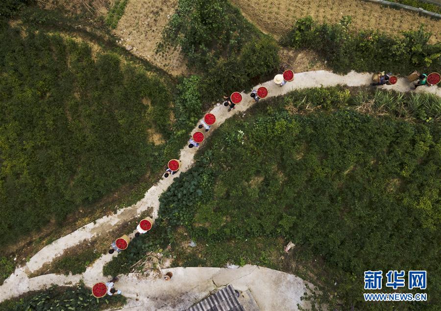 8月5日,在贵州省遵义市汇川区团泽镇,村民在转运刚刚采摘的朝天椒(无人机照片)。 近日,贵州省遵义市迎来辣椒采收季,村民们抢抓晴好天气采摘、晾晒辣椒,田间地头一派繁忙景象。 新华社发(罗星汉 摄)