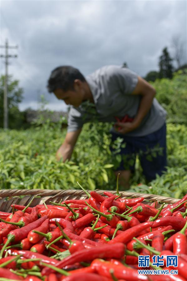 8月5日,在贵州省遵义市汇川区团泽镇,村民在采摘朝天椒。 近日,贵州省遵义市迎来辣椒采收季,村民们抢抓晴好天气采摘、晾晒辣椒,田间地头一派繁忙景象。 新华社发(罗星汉 摄)