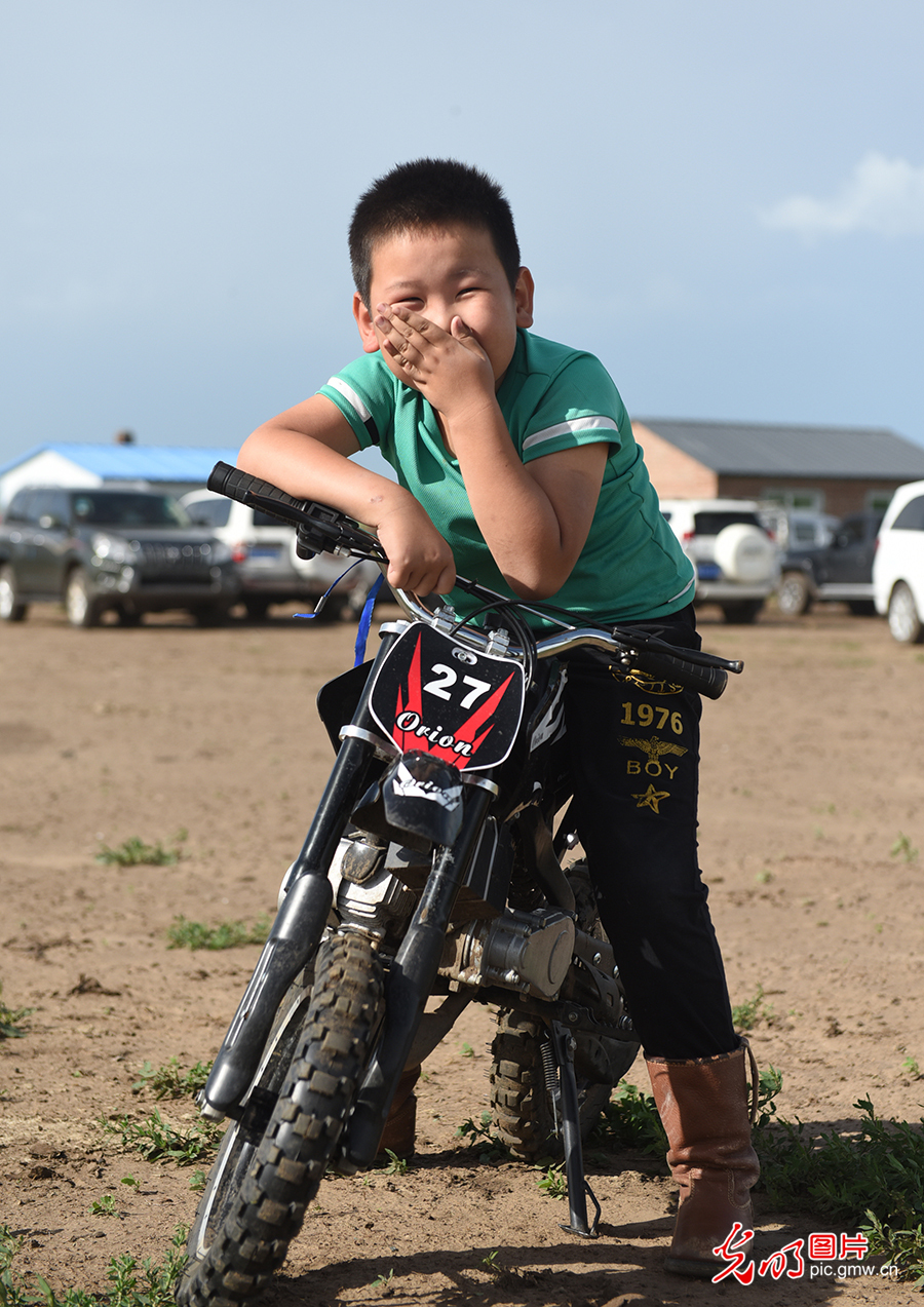 其日麦拉图的大孙子时常会来爷爷家。对他而言,胯下的儿童玩具车就是他的“骏马”,爷爷家的牧场就是他的后花园。图为2020年8月2日,其日麦拉图的孙子在牧场玩耍。(潘迪摄/光明图片)
