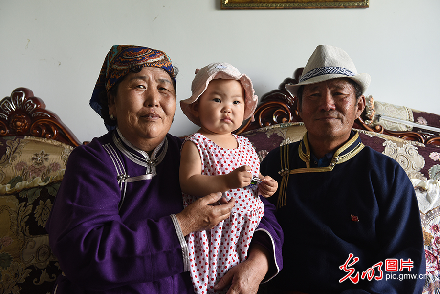 除了偶尔参加旗里的党员活动,其日麦拉图和老伴每日的生活就是含饴弄孙、养牛养马,日子过得惬意又自在。图为2020年8月2日,其日麦拉图夫妇和小孙女在自家客厅合影留念。(潘迪摄/光明图片)