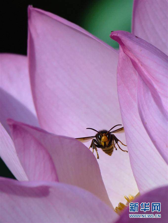 8月7日,在福州西湖公园的荷花池里,一只蜜蜂在花蕾中采蜜。 当日是立秋节气,意味着夏尽秋来,金风渐至。 新华社记者 魏培全 摄