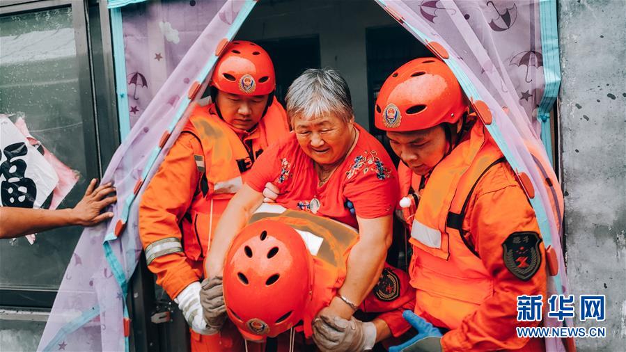 8月6日,在聊城市高唐县,消防队员转移被困群众(手机照片)。新华社发(宋建洲 摄)