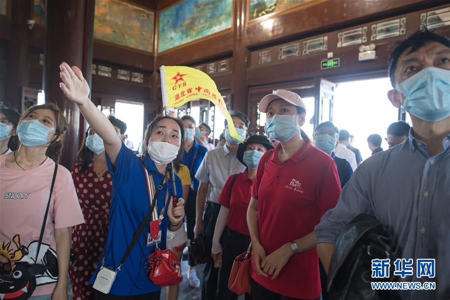 8月7日,导游在黄鹤楼景区为受邀来湖北旅游的援鄂医疗队员讲解。