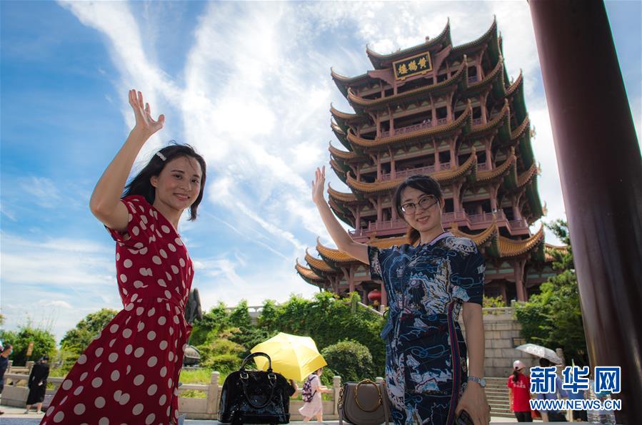 8月7日,受邀来湖北旅游的海南援鄂医疗队员陈小妹(左)与同事计超在黄鹤楼景区观光。新华社记者 肖艺九 摄