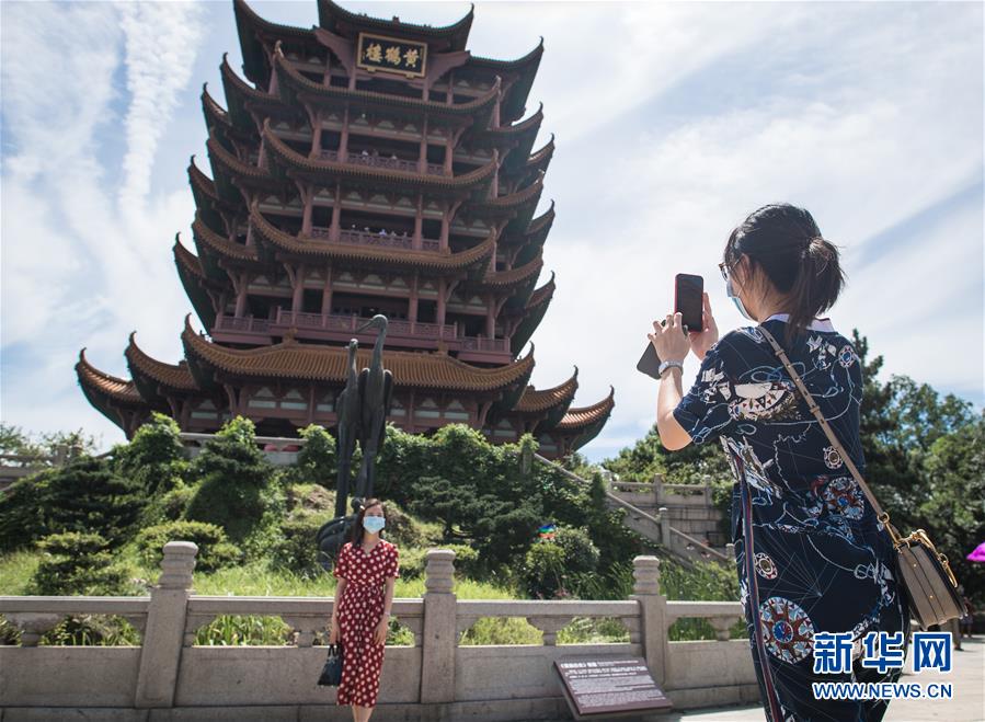 8月7日,受邀来湖北旅游的海南援鄂医疗队员陈小妹(左)与同事计超在黄鹤楼景区拍照。新华社记者 肖艺九 摄