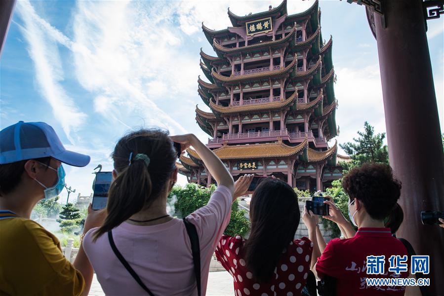 8月7日,受邀来湖北旅游的援鄂医疗队员在黄鹤楼景区拍照。新华社记者 肖艺九 摄