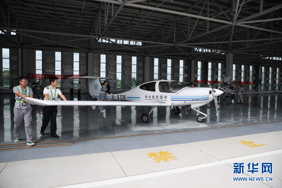 图为训练飞行前飞行学员和机务人员一同将训练机推出机库。新华网记者焦鹏摄