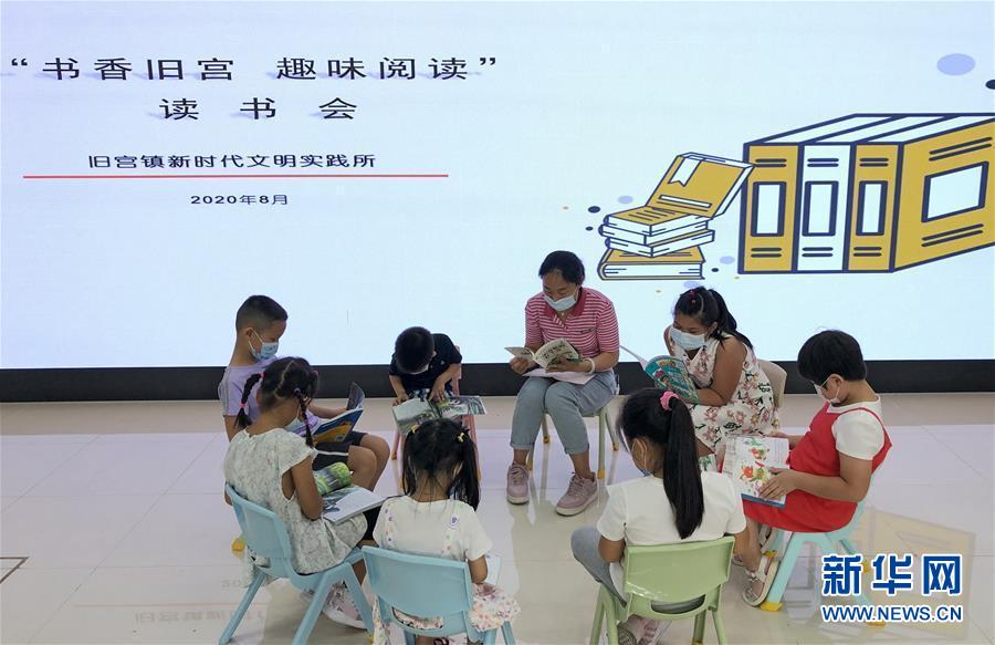 8月8日,小朋友们在大兴区旧宫镇文体中心老师带领下一起读书。新华社记者 李欣 摄