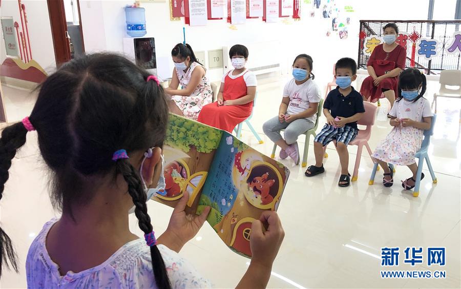 8月8日,大兴区旧宫镇的一名孩子在读书会上为其他小朋友读故事。新华社记者 李欣 摄