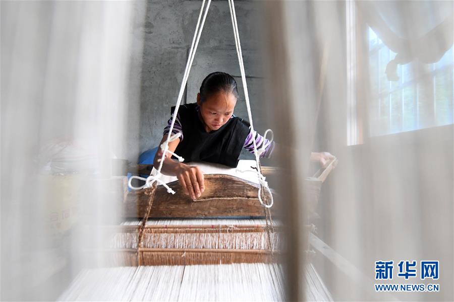 在广西南丹县“千家瑶寨·万户瑶乡”里湖王尚易地扶贫搬迁安置点,居民陆老爱的爱人何桂英在新居里织布(8月6日摄)。新华社记者 陆波岸 摄