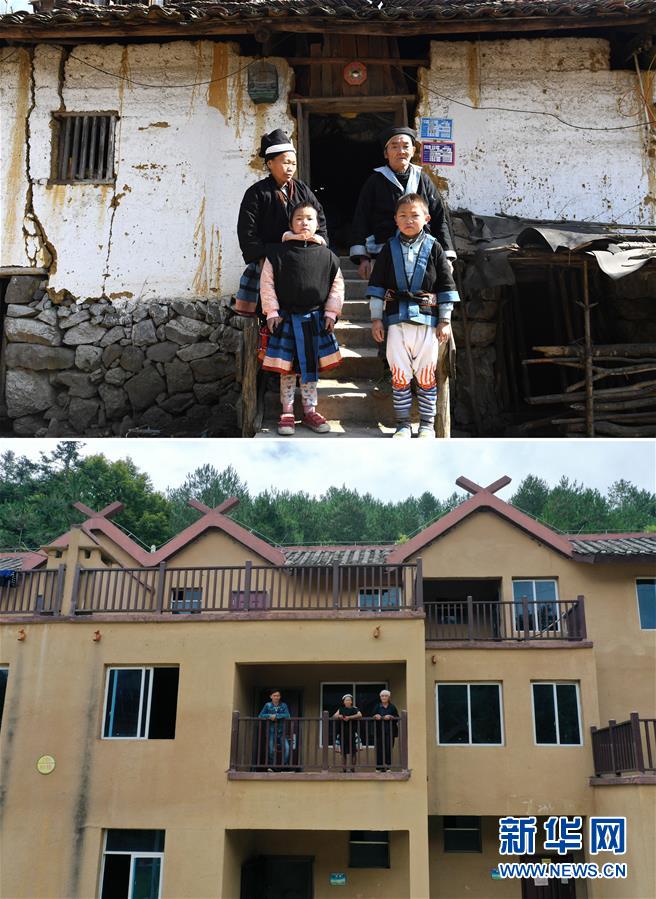 这是一张拼版照片。上图:村民韦金林(后右)一家在广西南丹县里湖瑶族乡董甲村戈底屯自家门前合影留念(2018年1月11日摄)。下图:村民韦金林(右)和爱人、儿子站在广西南丹县“千家瑶寨·万户瑶乡”里湖王尚易地扶贫搬迁安置点自家阳台上(8月5日摄)。新华社记者 周华 摄