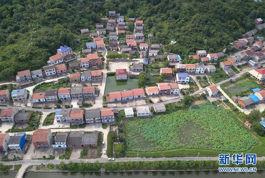 鸟瞰鄂州市长港镇峒山村(8月6日摄,无人机照片)。 近年来,湖北省鄂州市长港镇峒山村着力提升村居环境,积极实施厕所改造、污水处理、道路硬化、植树绿化等措施,改善乡村面貌,提升村民幸福感。 新华社记者 程敏 摄
