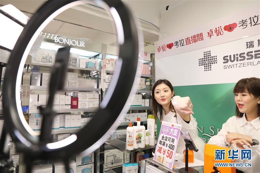 香港一家零售店的员工在直播带货(6月5日摄)。 新华社记者 吴晓初 摄