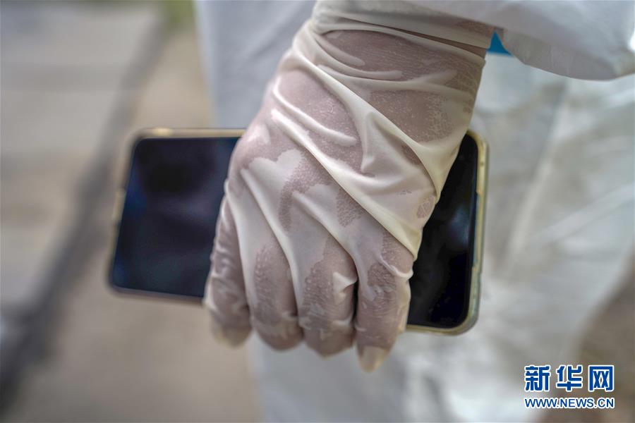 在乌鲁木齐市天山区人民路南社区里,长时间身穿防护服,仇婷婷的手套里全是汗水(8月6日摄)。