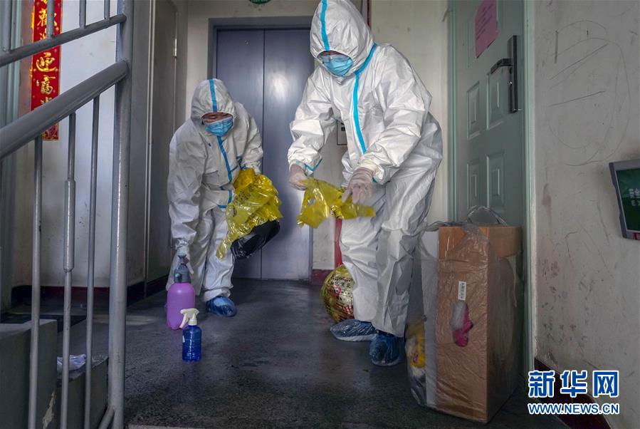 在乌鲁木齐市天山区人民路南社区一栋住宅楼单元门口,仇婷婷(右)和同事在收取居家隔离观察人员的生活垃圾(8月6日摄)。 新华社记者 赵戈 摄