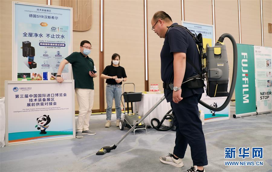8月8日,一位德国品牌参展商工作人员(右)展示一台背负式吸尘器。 当日,第三届进博会技术装备展区展前供需对接会在国家会展中心(上海)举行。60余家参展商和100余家采购商在对接会上通过介绍和观看展品、互动演示和远程网络连线等方式交流洽谈。 新华社记者 方喆 摄