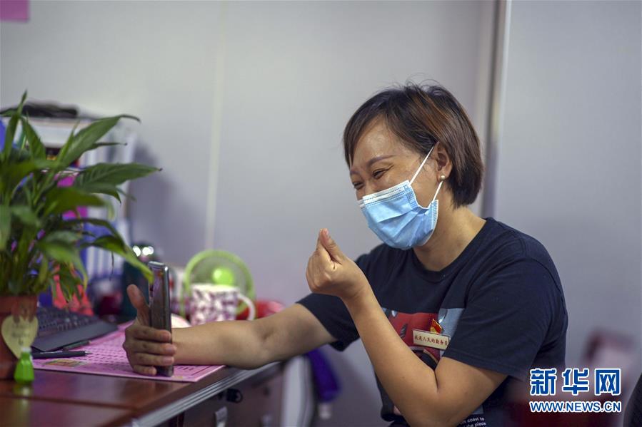 在乌鲁木齐市天山区人民路南社区办公室里,仇婷婷和家人视频通话(8月6日摄)。 新华社记者 赵戈 摄