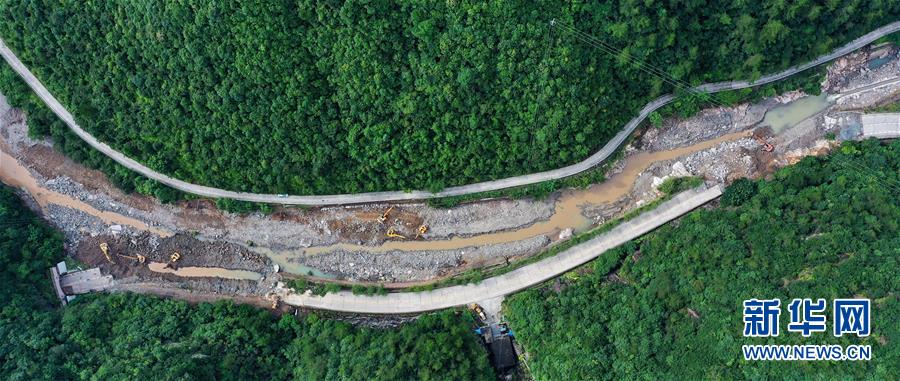 8月9日,挖掘机等大型机械在抢修水毁公路(无人机照片)。 受台风“黑格比”影响,浙江S322省道台州市仙居县湫山乡境内一段公路被山洪冲毁,交通中断。险情发生后,相关部门紧急采取措施,全力投入抢修工作。 新华社发(王华斌 摄)