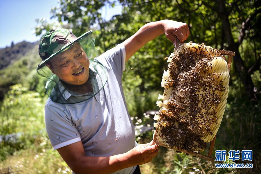 陕西汉中市留坝县火烧店镇天星亮村村民在展示扶贫社养殖的蜜蜂(7月2日摄)。秦岭生态资源丰富,具有得天独厚的蜜蜂养殖条件,但多年来山区农户自产自销的模式收益甚少。近年来,多地采取“农户+合作社”模式,让山区群众养蜂增收有了保障。 新华社记者 刘潇 摄