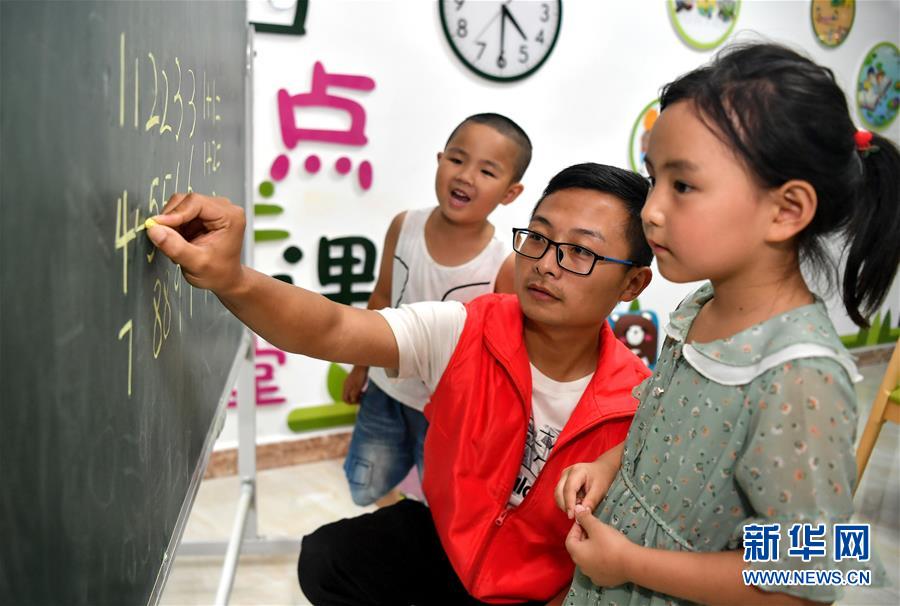 陕西安康市岚皋县城关镇城北易地扶贫搬迁安置小区“四点半课堂”的老师在辅导孩子们学习数字(7月29日摄)。地处秦巴山区的岚皋县山多沟深,群众居住分散,长期以来易地搬迁成为这里脱贫攻坚的重点。为避免易地搬迁群众就业不充分、办事不方便、管理不到位等问题,岚皋县依托市场完善社区生活、医疗、教育、娱乐等服务设施,并开展技能培训、开办社区工厂,让搬迁居民“稳得住”“能致富”。 新华社记者 刘潇 摄