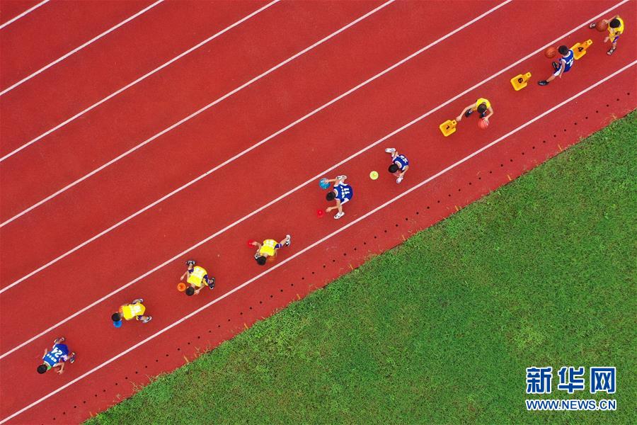8月9日,在泗洪县魏营镇中心小学操场上,参加暑托班的孩子参加篮球训练(无人机照片)。 暑假期间,江苏省泗洪县利用政府补贴和社会资源,为困难家庭和农村留守儿童举办“爱心暑托班”,提供文体娱乐、心理疏导、法治教育、安全自护、素质拓展等活动,帮助孩子们度过一个安全、快乐、有意义的假期。 新华社发(许昌亮 摄)