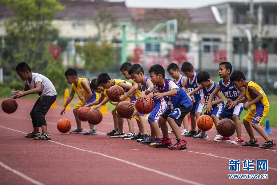 8月9日,在泗洪县魏营镇中心小学操场上,参加暑托班的孩子参加篮球训练。 暑假期间,江苏省泗洪县利用政府补贴和社会资源,为困难家庭和农村留守儿童举办“爱心暑托班”,提供文体娱乐、心理疏导、法治教育、安全自护、素质拓展等活动,帮助孩子们度过一个安全、快乐、有意义的假期。 新华社发(许昌亮 摄)