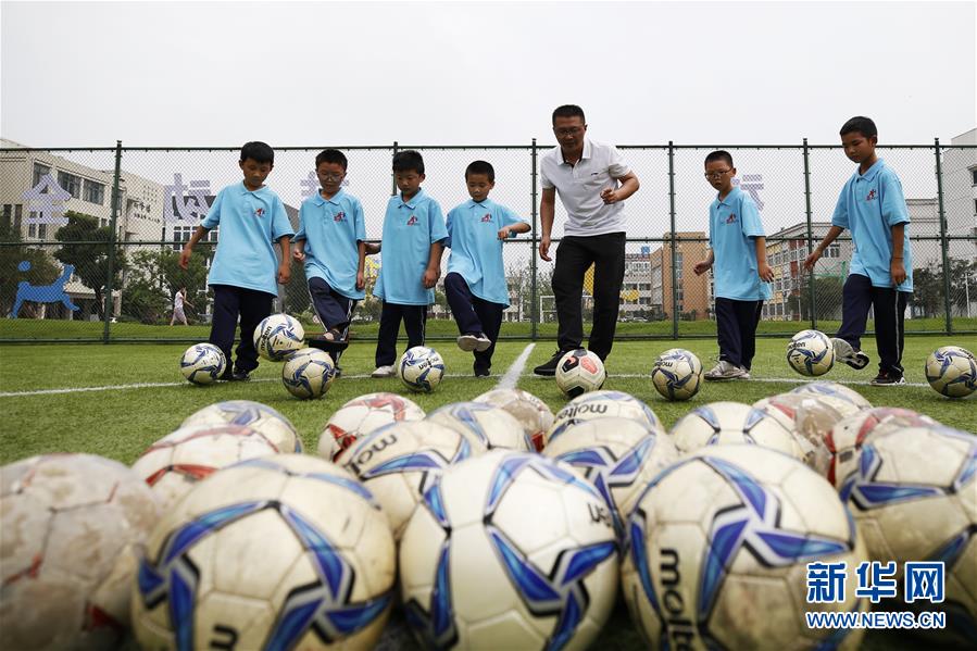 8月9日,在泗洪县魏营镇中心小学操场上,老师带着暑托班的孩子进行足球训练。 暑假期间,江苏省泗洪县利用政府补贴和社会资源,为困难家庭和农村留守儿童举办“爱心暑托班”,提供文体娱乐、心理疏导、法治教育、安全自护、素质拓展等活动,帮助孩子们度过一个安全、快乐、有意义的假期。 新华社发(许昌亮 摄)