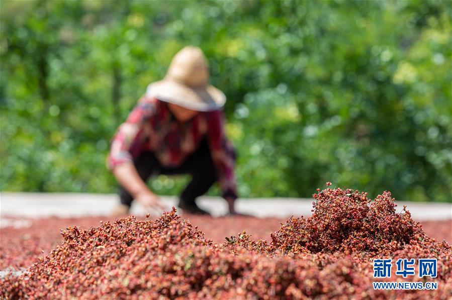 8月9日,武安市徘徊镇后李甲村农民在凉晒采摘的花椒。 近日,河北省武安市花椒进入收获季节,当地农民抢抓农时,花椒种植基地里一派忙碌景象。近年来,武安市将花椒产业作为脱贫增收的重要抓手,因地制宜扩大花椒种植规模。目前,全市花椒种植面积约12万亩。 新华社记者 王晓 摄