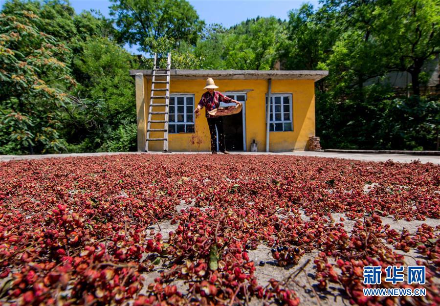 8月9日,武安市徘徊镇后李甲村农民在凉晒采摘的花椒。 近日,河北省武安市花椒进入收获季节,当地农民抢抓农时,花椒种植基地里一派忙碌景象。近年来,武安市将花椒产业作为脱贫增收的重要抓手,因地制宜扩大花椒种植规模。目前,全市花椒种植面积约12万亩。 新华社记者 王晓 摄