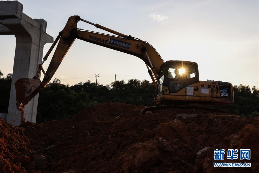 8月9日,中铁十一局施工人员在清远磁浮旅游专线终点站长隆主题公园站进行站场土建施工。新华社记者刘大伟摄