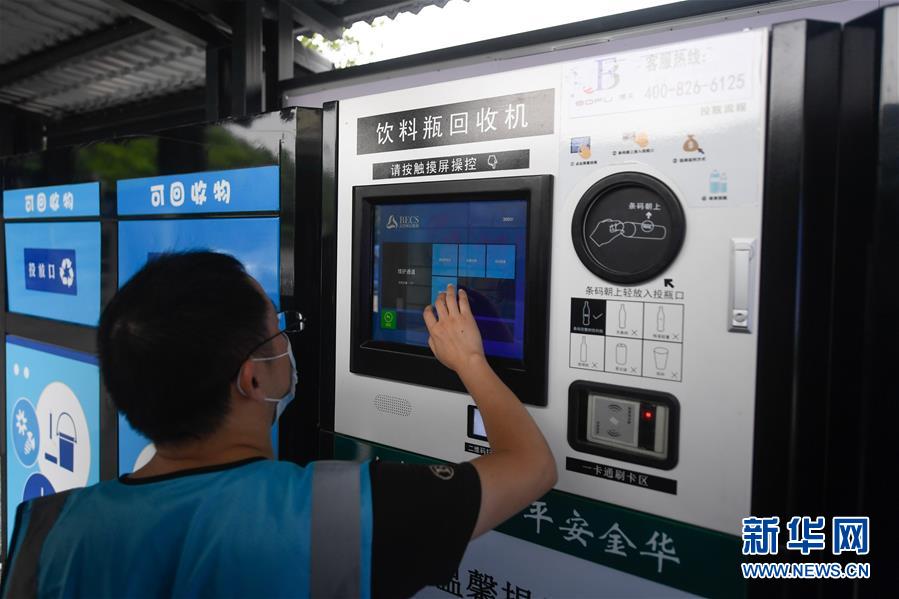 网格员在金华市金东区东孝街道一处垃圾分类投放点操作饮料瓶回收机(7月16日摄)。 近年来,浙江省通过创新宣传教育,多措并举促进垃圾分类投放、收运及处置的良性循环,引领垃圾分类成为城乡居民的生活新风尚。 新华社记者 黄宗治 摄