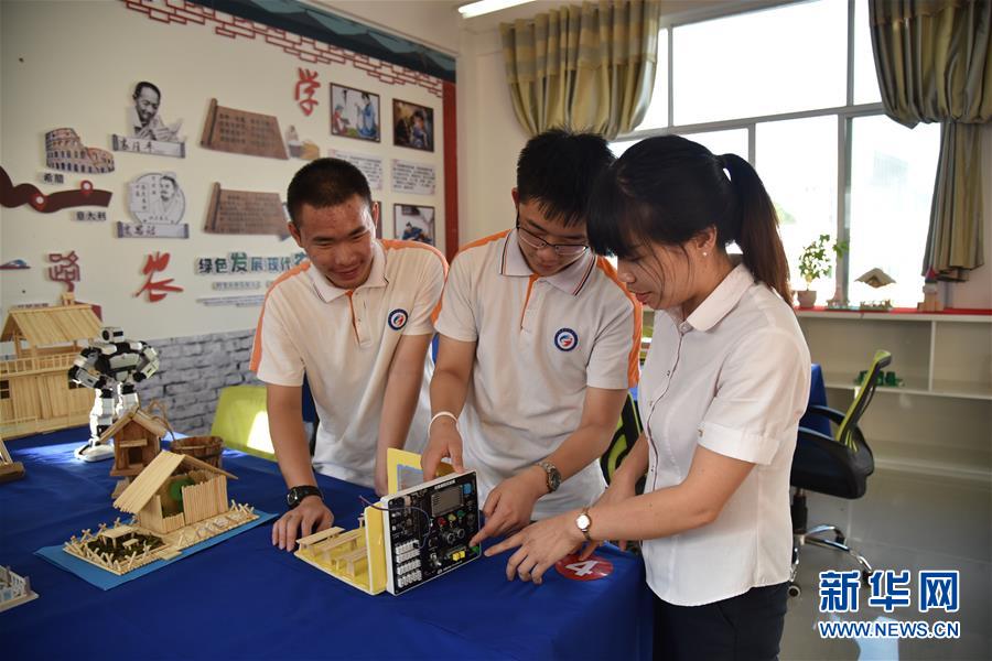 在贵州省黔南布依族苗族自治州长顺县民族高级中学,老师(右)指导学生开展科技活动(7月28日摄)。新华社记者 骆飞 摄