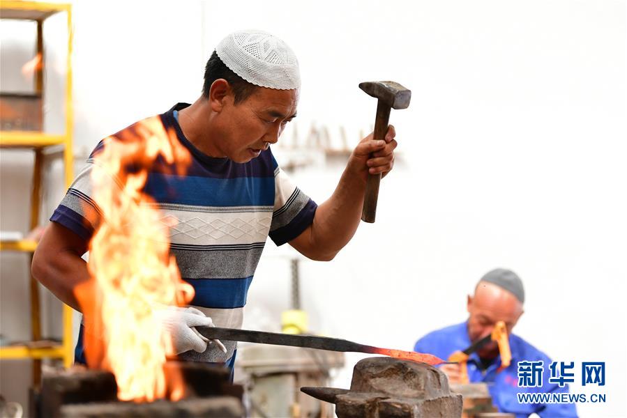 8月10日,甘肃省临夏回族自治州积石山县大河家镇的村民马维正在制作保安腰刀。新华社记者 陈斌 摄