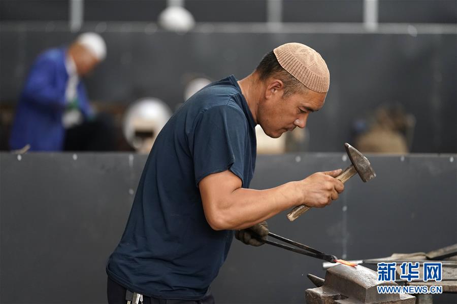8月10日,甘肃省临夏回族自治州积石山县大河家镇的村民在制作保安腰刀。新华社记者 邢广利 摄